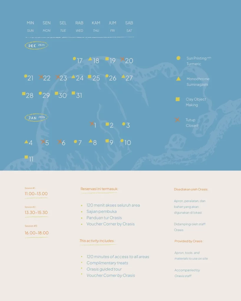 Schedules available for reservation: Session 1: 11.00 – 13.00 Session 2: 13.30 – 15.30 Session 3: 16.00 – 18.00